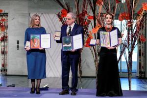 Þríeyki frá þjóðunum þremur í miðju stríðsins í Úkraínu tóku við friðarverðlaunum Nóbels í dag og öll hvöttu þau til þess að baráttunni yrði haldið áfram af fullum krafti gegn „geðveikri og glæpsamlegri“ innrás Vladimírs Pútín, leiðtoga Rússlands.