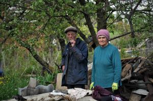 El camino que une Izium con Sloviansk ofrece un panorama desolador de pueblos que estuvieron en el frente de guerra y ahora están arrasados. Serhii y Olga quieren volver a su hogar en uno de ellos