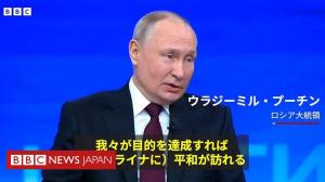 プーチン氏「/末恒例の記者会見」2/ぶり BBC記者、侵攻後初の質問機会だが…… 2023年12月15日 イギリスBBCテレビ局記事bbc | copper_mole BBCニュースプーチン氏「年末恒例の記者会見」2年ぶり BBC記者、侵攻後初の質問機会だが…… - ...https://www.bbc.com/japanese/video-67724332「我々が目的を達成すれば(ウクライナに)平和が訪れる」、ウクライナにおける「非ナチス化と非軍事化、中立化」という「目的は変わらない」と述べるなど、侵攻に関するプーチン氏の発言は自信に満ちていた。